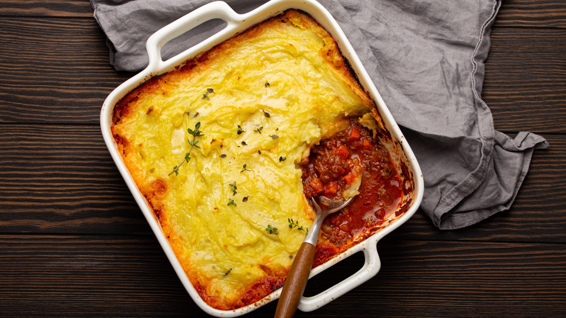 В небольшую форму выложите компоненты слоями. Сперва половину картошки, затем половину яичной смеси, весь фарш, тертый сыр, оставшийся картофель и яйцо.