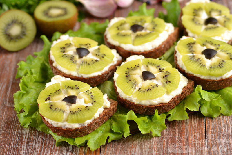 Комбинация киви и сыра всегда выглядит выигрышно. В миске следует смешать 6 ст. л. майонеза, 3 зубчика чеснока, пропущенные через пресс, и 50 г натертого полутвердого сыра. Ржаной хлеб (7 ломтиков) рекомендуется нарезать пополам, по желанию подсушивая в духовке. Киви (3 шт.) очищаются и нарезаются на кружочки. На хлеб положить сырную смесь, сверху разместить 5 ломтиков киви и украсить мелко нарезанными маслинами. Эти бутерброды отлично смотрятся на столе и удивляют своим взрывом вкуса.