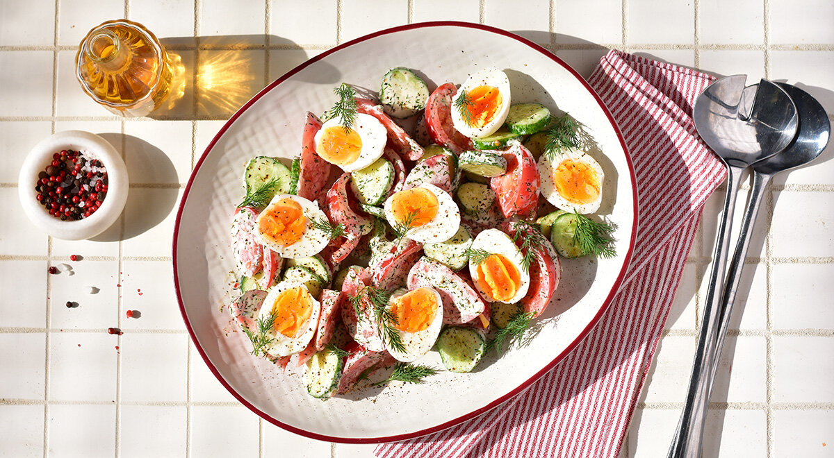 Май — это время для свежих, хрустящих овощей. Советуем вам попробовать классическое сочетание помидоров и огурцов, но с интересной заправкой из укропа и детского творожка. Это не просто салат — это легкая закуска, способная изменить ваше представление об обычных ингридиентах.