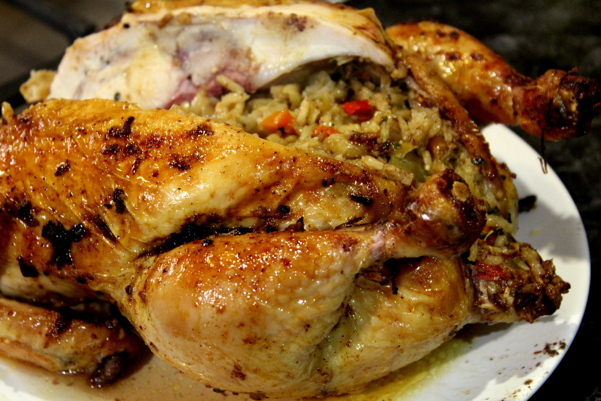 Разогрейте духовку до 220°C, смажьте форму сливочным маслом, нафаршируйте курицу рисом, свяжите ножки и запекайте 1,5 часа при температуре 190°C, поливая соком каждые полчаса. После запекания дайте курице отдохнуть 15 минут, и подавайте к столу с любимым соусом и овощным салатом.