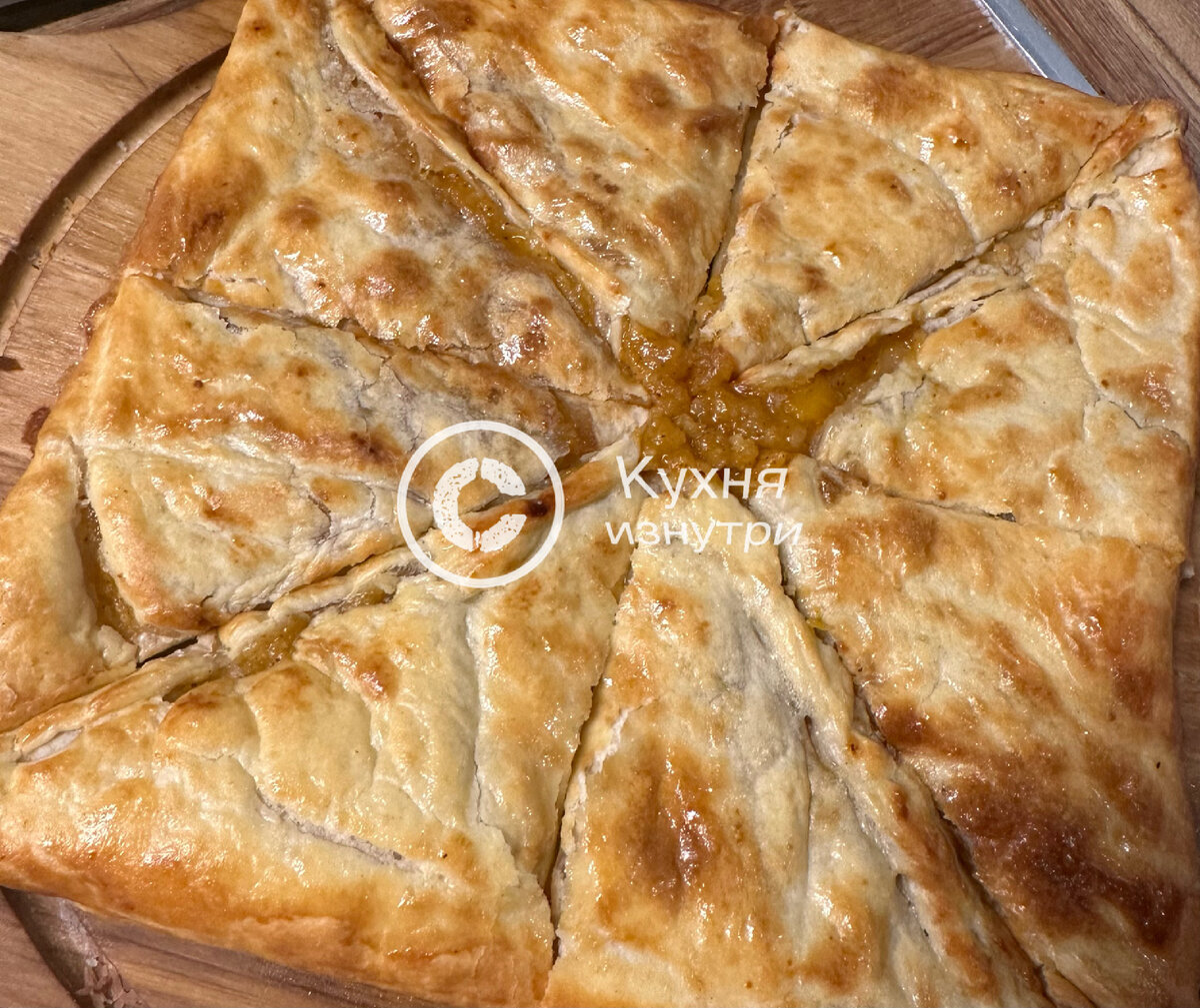 На середину теста кладется начинка, после чего края заворачиваются к центру, образуя аккуратные складки. Пирог необходимо смазать взбитым яйцом для золотистой корочки, а затем отправить в предварительно разогретую до 200 градусов духовку. Выпекать необходимо примерно 10 минут до появления аппетитного румянца.
