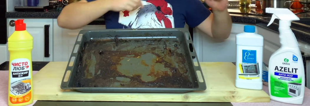 В роли объекта нашего эксперимента выступил противень, щедро бывший покрыт пригоревшим жиром после запекания ароматного куриного блюда. Для достижении наилучшего результата, противень был предварительно нагрет — участники нашего теста так часто советуют в подобных случаях.