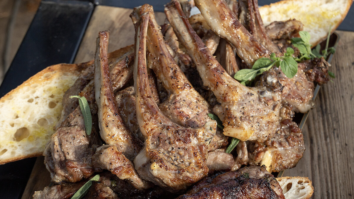 После маринования каре барашка выкладывают на решетку и обжаривают на углях до получения идеальной степени готовности. В качестве дополнения к мясу прекрасно подойдет теплый овощной салат. Для его приготовления цукини или кабачки нарезают тонкими слайсами и обжаривают на решетке, предварительно приправив солью и сбрызнув оливковым маслом. Помидоры также насаживаются на шампуры и готовятся до мягкости.