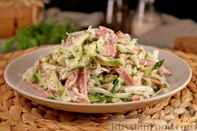 - Салат из капусты с огурцами и колбасой: Этот легкий и сытный салат готовится быстро и просто. Копченая колбаса придаёт особый аромат, а свежие огурцы и капуста наполняют блюдо хрустящей текстурой. Для заправки можно использовать майонез или легкий уксус.
