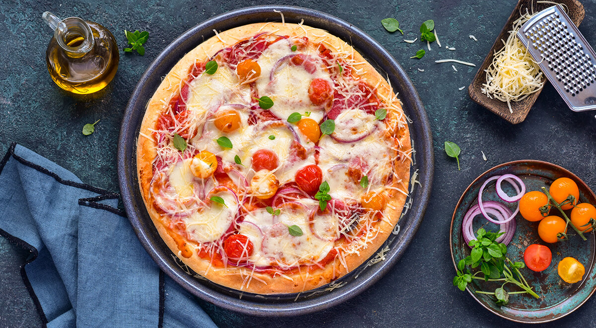 - Для начинки: 70 г красного лука, 70 г копченой колбасы, 70 г помидоров черри, 100 г моцареллы, 2 ст. л. томатного соуса и немного тертого твердого сыра по вкусу.