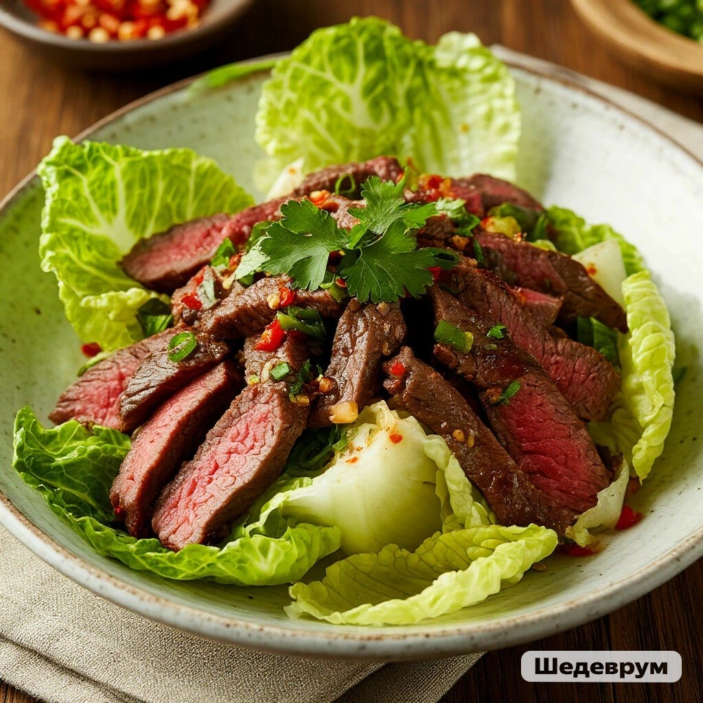 Чтобы приготовить это блюдо, говядину нарезают соломкой и обжаривают на раскаленном растительном масле до появления золотистой корочки. Овощи: капусту, морковь и огурцы также нарезают соломкой и смешивают с обжаренным мясом. Для заправки готовится соус из соевого соуса, уксуса и масла, после чего все ингредиенты перемешиваются. Так салат получается легким и хрустящим, идеальным для зимнего ужина.