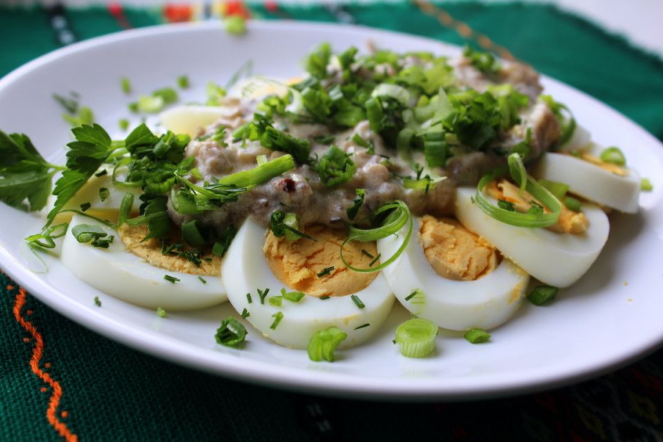 На сервировочное блюдо уложите нарезанные яйца, а сверху щедро выложите грибную смесь. Для завершения композиции посыпьте блюдо свежей зеленью. Это блюдо прекрасно сочетается с гарнирами, такими как гречневая каша или картофельное пюре.
