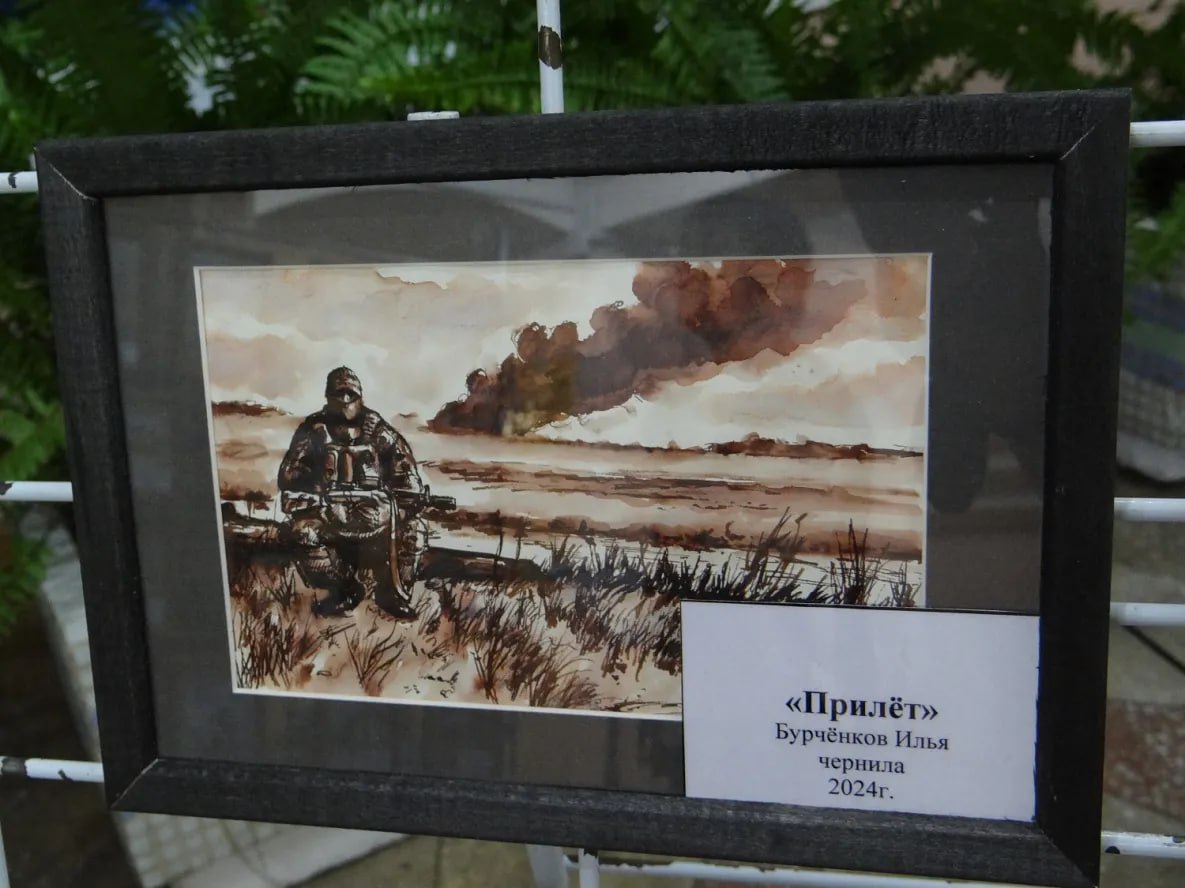Илья Бурчёнков с 2022 года участвовал в специальной военной операции. Полевые зарисовки, которые художник делал во время командировок в зону проведения боевых действий, легли в основу его рисунков. Часть из них представлена на выставке в библиотеке.Небольшие работы, выполненные чернилами и акварелью, посвящены работе военнослужащих Армии России в зоне проведения специальной военной операции и памятным для художника местам.