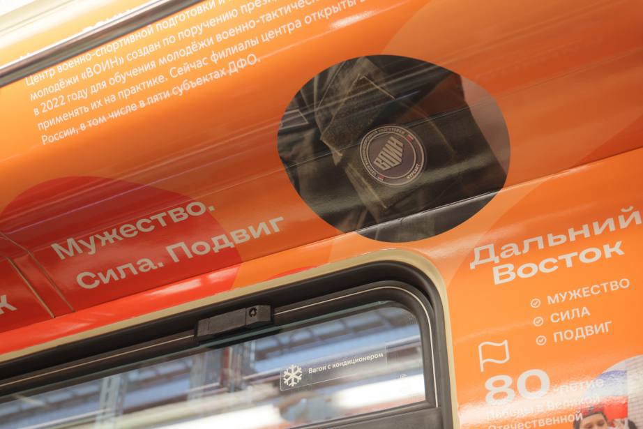 В первых вагонах представлены достижения, тренды, инновации ДФО. Далее можно найти информацию о подвиге дальневосточников. Особое внимание – поддержке дальневосточными регионами СВО.