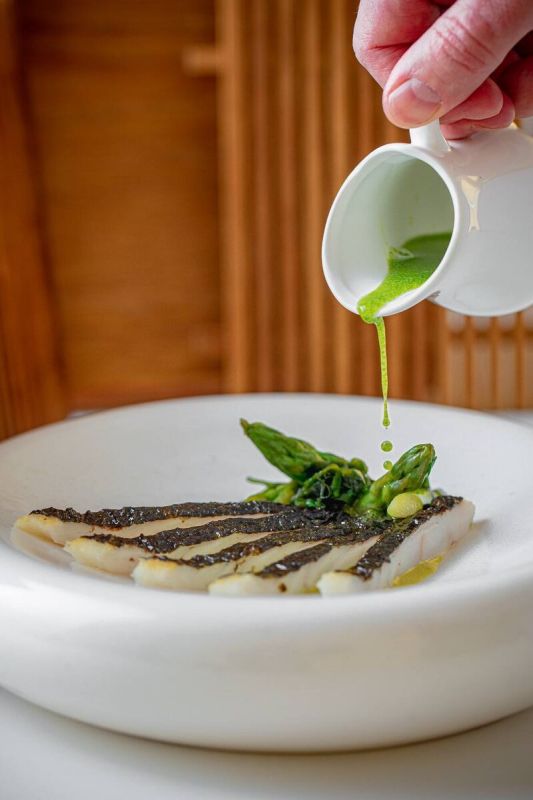 В качестве гарнира шеф-повар предлагает две разновидности спаржи: воздушное пюре и хрустящие свежие кусочки. Это дуэт придаёт блюду ещё больше глубины и разнообразия. Завершающим аккордом служит копчёный рыбный бульон, который добавляет нотки умами и ярко выделяет все ингредиенты.