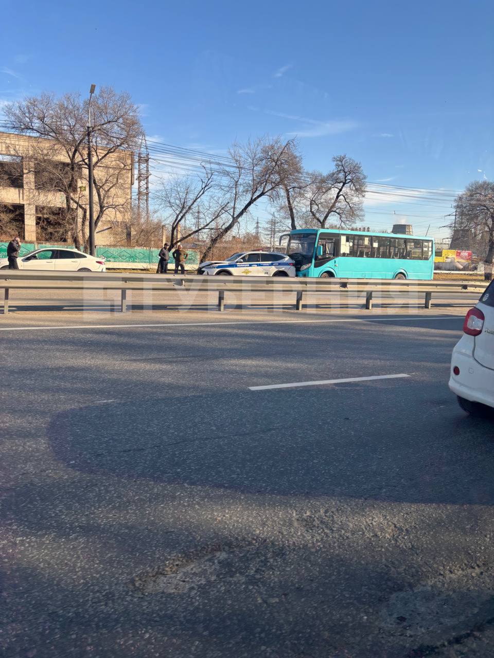 ДТП произошло на улице Краснореченской, у поворота на Индустриальную. По предварительным данным, водитель автобуса №85 допустил столкновение с припаркованным патрульным автомобилем ДПС, который от удара отбросило на впереди стоящий автомобиль.