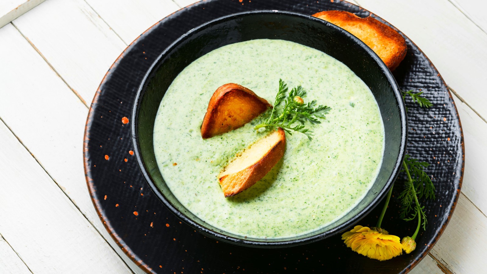 Блендером пюрируйте суп и добавьте сливки. Посолите, приправьте по вкусу и прокипятите пару минут. Подавайте с гренками и зеленью, пишет портал Steaklovers.