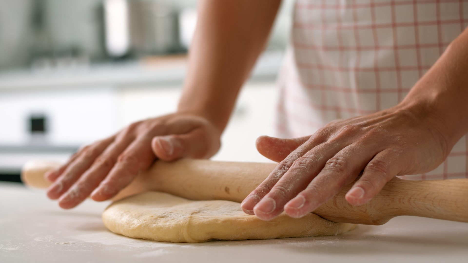Тесто нарежьте на полоски шириной 5–7 см. Сверните первую в рулетик, затем положите ее в начало второй и опять сверните. То же повторите с оставшимися полосками.