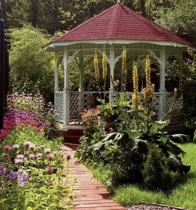 Обратите внимание на то, насколько удобно будет добираться до беседки. Дорожка должна быть достаточно широкой, чтобы можно было без труда переносить еду и напитки. Если ваша беседка должна стать местом для спокойного отдыха, отличным выбором будет площадка за кустами, которая обеспечит приватность, но не отрежет от дома.