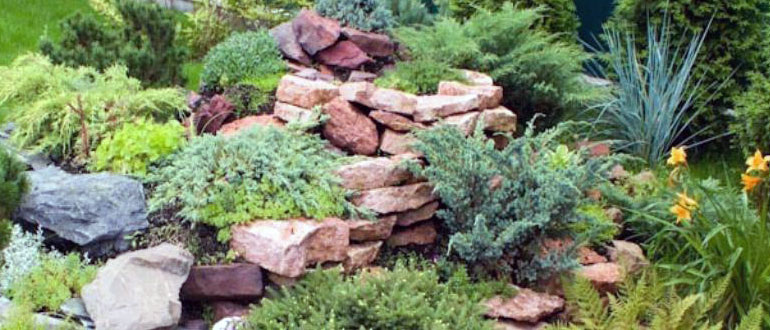При размещении камней используйте подход к оформлению, как будто горные породы естественным образом появляются на поверхности земли. Вершину горки украшают самые крупные камни конусообразной формы, а склоны заполняются плоскими массивными камнями. В нижней части альпинария можно обложить бордюры такими же плоскими камнями, а для перехода к вершине использовать их же в виде лестницы.
