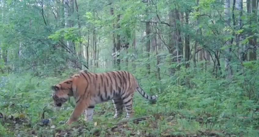 Сын Желтобокой снял с дерева фотоловушку и стал ее изучать. Правда, изучение оказалось недолгим – большой кот поигрался с ней пару минут и потерял интерес.