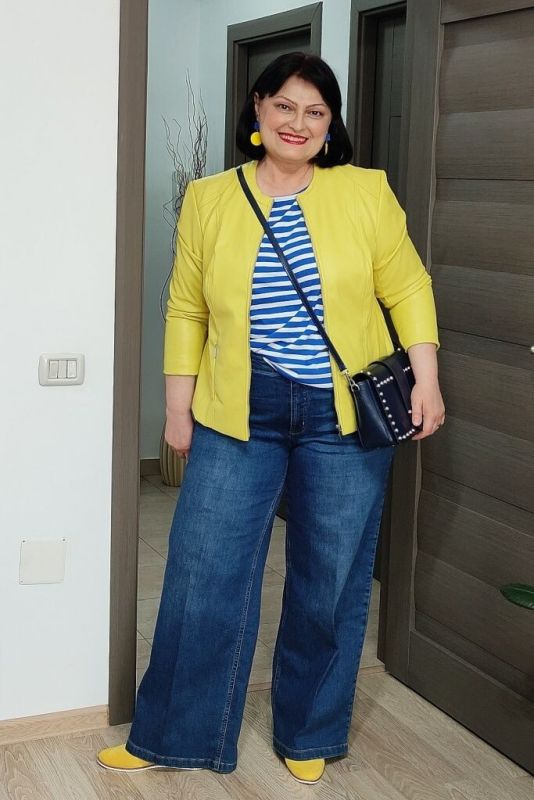 - Темно-синие широкие джинсы: этот универсальный элемент гардероба подходит дамам любой комплекции. Подходите к ним с "тельняшкой" и желтой курткой — такой образ будет отлично удачно сочетать яркость и стиль. Не забудьте добавить сумочку через плечо и эффектные серьги для завершения наряда.