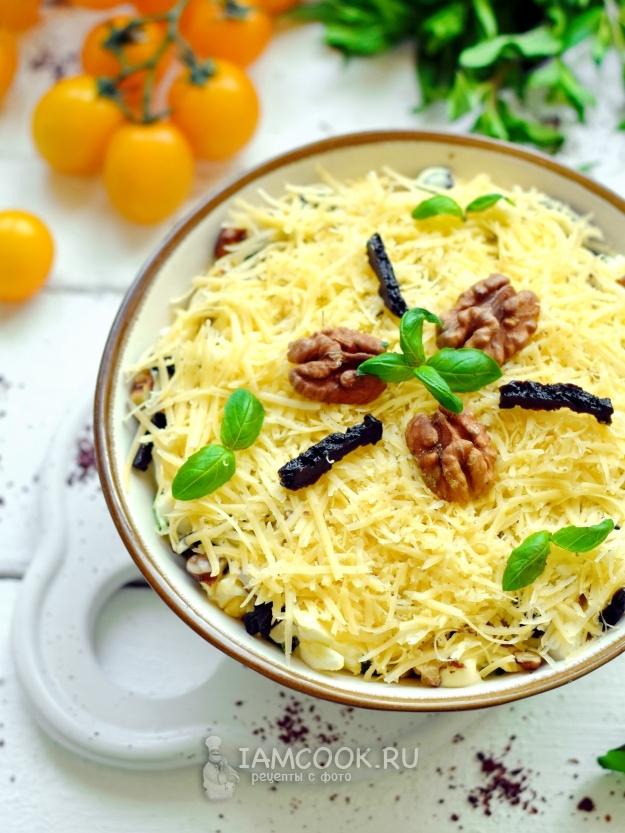 Этап 5: Чернослив с копчеными нотками нарезать тонкими полосками и разместить в салате, а затем добавить измельчённые грецкие орехи. Это обеспечит блюду хрустящий акцент. Завершает композицию тертый сыр, который не стоит смазывать майонезом, чтобы сохранить его легкость и свежесть.