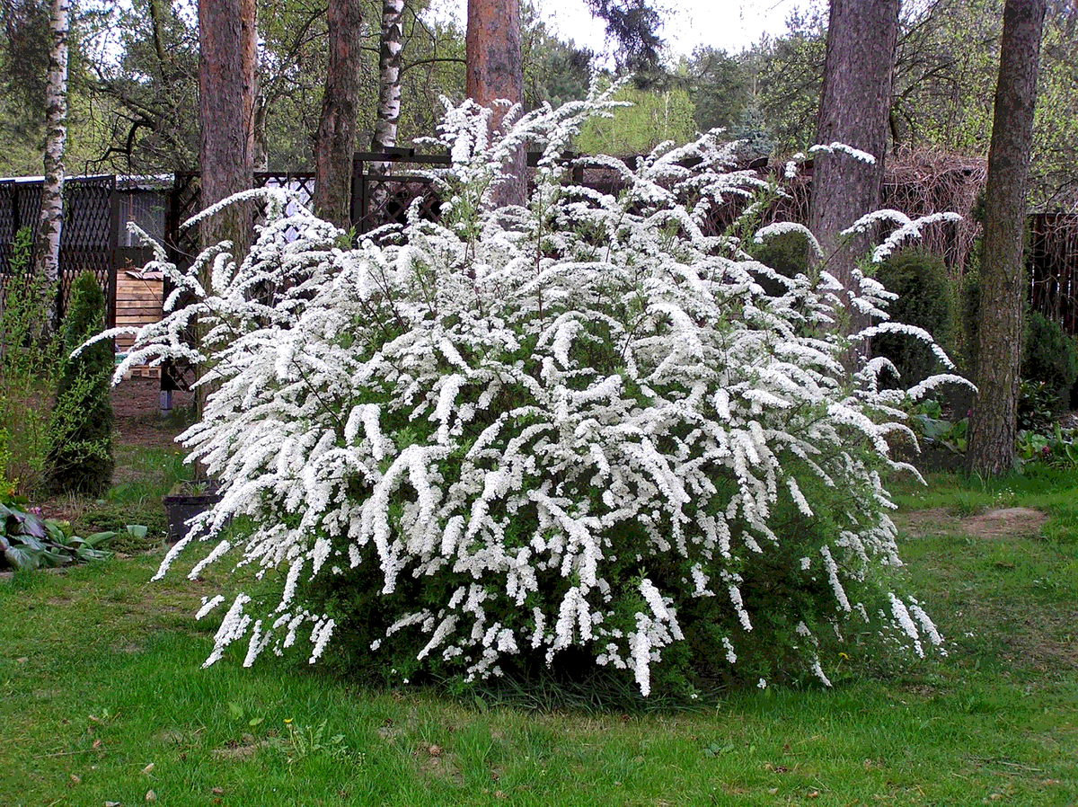 - Спирея: Цветет с мая по июнь, привнося в сад великолепные белоснежные цветы. Особенно хороша спирея с серыми листьями, способная создать эффектную крону.