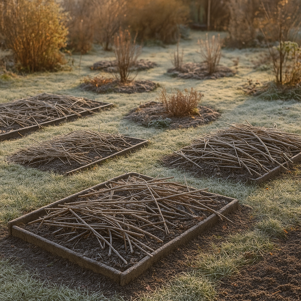 - Сухие ветки лиственных деревьев: После обрезки деревьев стоит сохранять тонкие ветви. Их можно укладывать поверх растений в виде решетки, что создаст необходимый воздушный зазор и защитит от снежных нагрузок.
