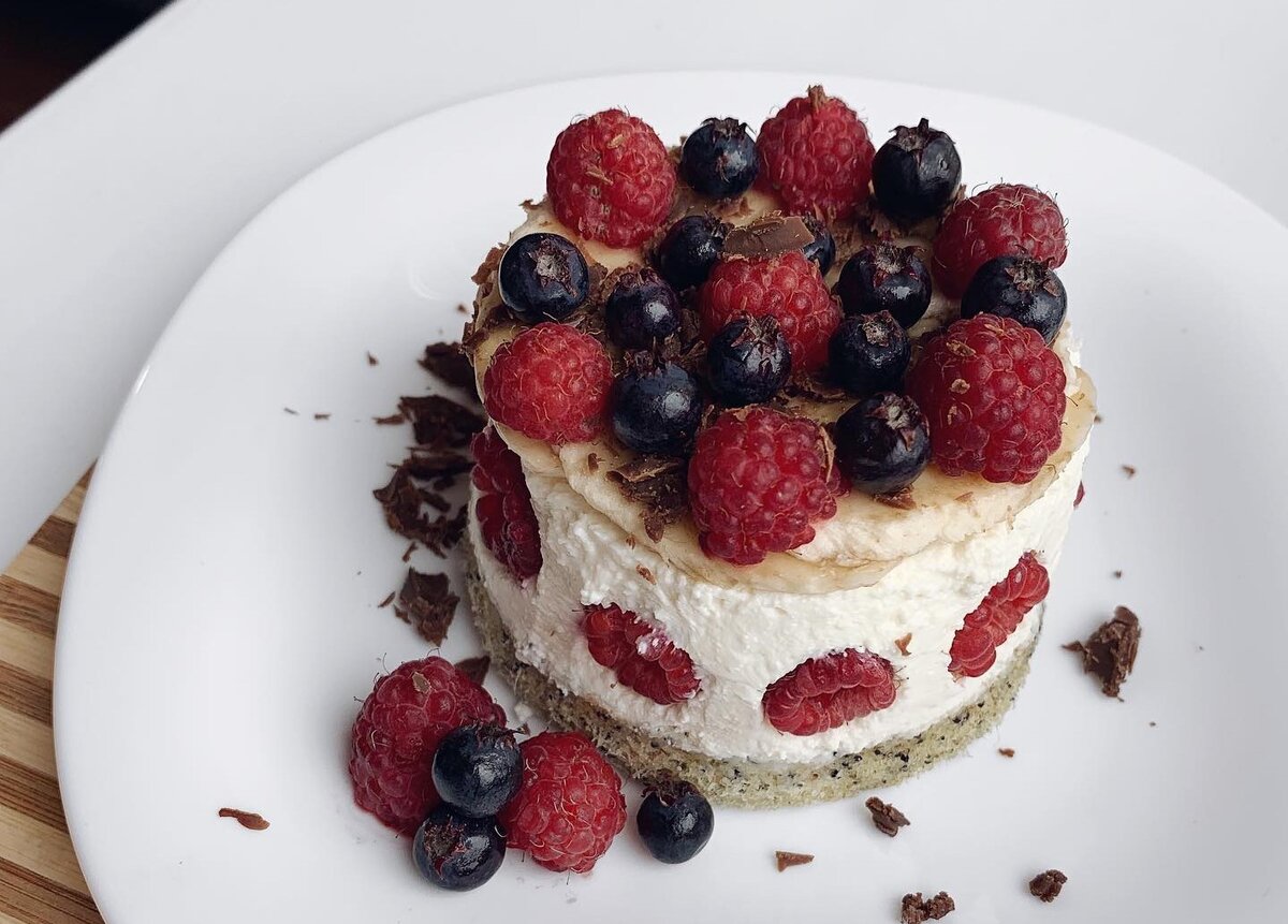 Пришло время собрать десерт. На одну половину бисквита щедро нанести творожный крем, затем накрыть второй половинкой. Декорировать по желанию: свежими ягодами, такими как малина, черника или банан. Дополнительно можно добавить кусочек полезного шоколада без сахара для последнего штриха.