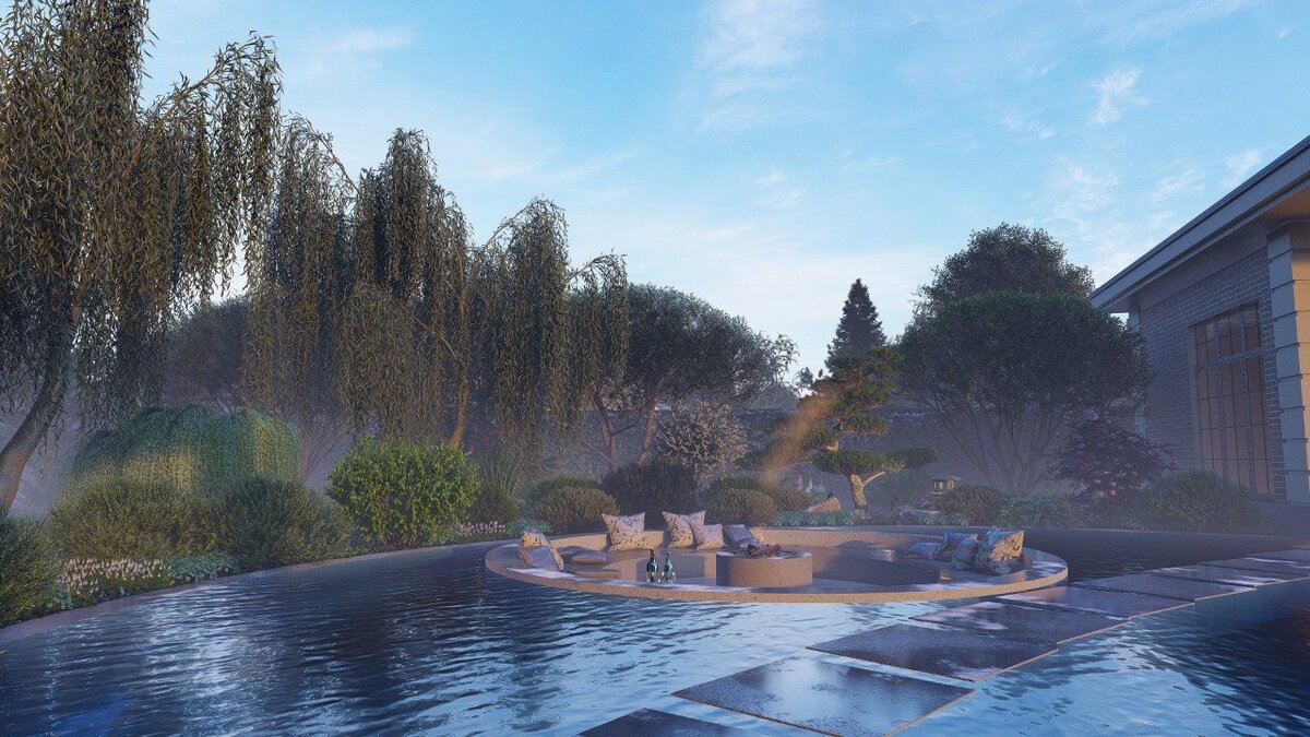 Интересной является идея о размещении водного зеркала между двумя основными постройками, которое будет служить не только украшением, но и зоной для отдыха около костра. Японские стили садов и сочетание ярких цветов с пастельными нюансами — это лишь малая часть творческих решений, предложенных в этом проекте.