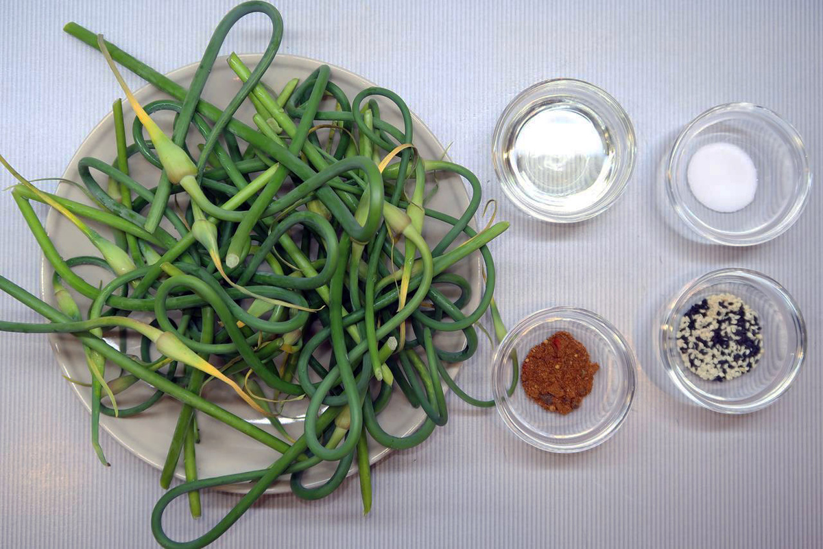 Прежде всего, чесночные стрелки стоит тщательно промыть под холодной водой и дать им немного подсохнуть. Удалите верхнюю часть стрелок вместе с бутоном, а также нижнюю, менее темную часть — эти кусочки не понадобятся для рецепта. Остальные стрелки нарежьте на небольшие сегменты длиной примерно в 3–4 сантиметра.