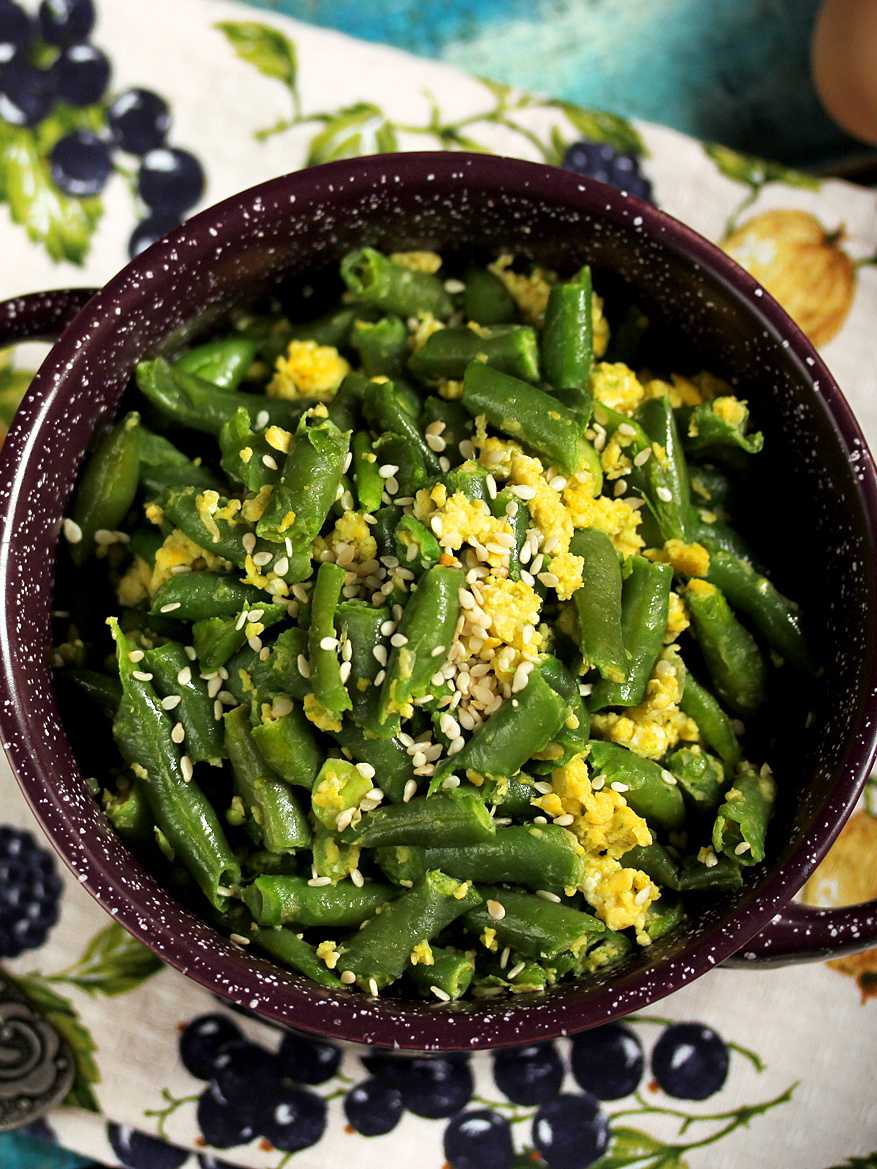 Яичный компонент: В отдельной миске слегка взбейте яйца, чтобы желтки соединились с белками. Залейте полученную смесь на поджаренную фасоль и активно перемешивайте, чтобы яйцо равномерно распределилось и сформировало аппетитные кусочки, а не однородный омлет.