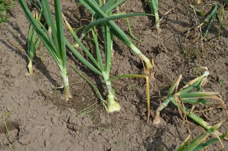 Признаки полного созревания лука можно увидеть по пожелтевшим перьям и смягчению шеек. Когда примерно 80% пера начинает желтеть, это указывает на то, что лук готов к сбору. Чаще всего проверяется также состояние стрелок: если пленочка на стрелках рвется, значит, луковицы готовы к уборке.