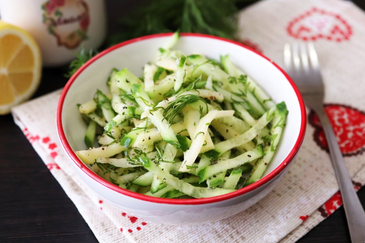 Процесс приготовления не займет много времени. В первую очередь необходимо нарезать огурец и яблоко тонкой соломкой. Рекомендуется очистить яблоко от кожицы, чтобы добиться более нежной текстуры. Затем следует мелко нарезать укроп, добавляя яркое зелёное безмолвие блюда.