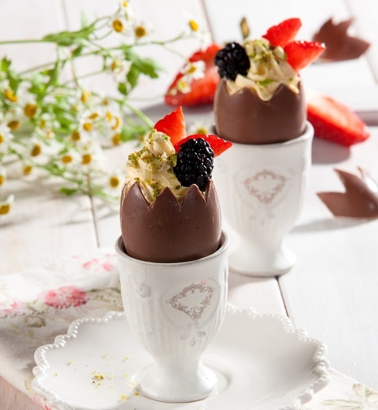 Затем заполните каждую половинку шоколадного яйца кремом с помощью кулинарного шприца. Установите яйца на специальные подставки, чтобы они не упали. В завершение перед подачей украсьте десерт нарезанными фисташками и свежими ягодами, которые придадут блюду красочный и аппетитный вид.