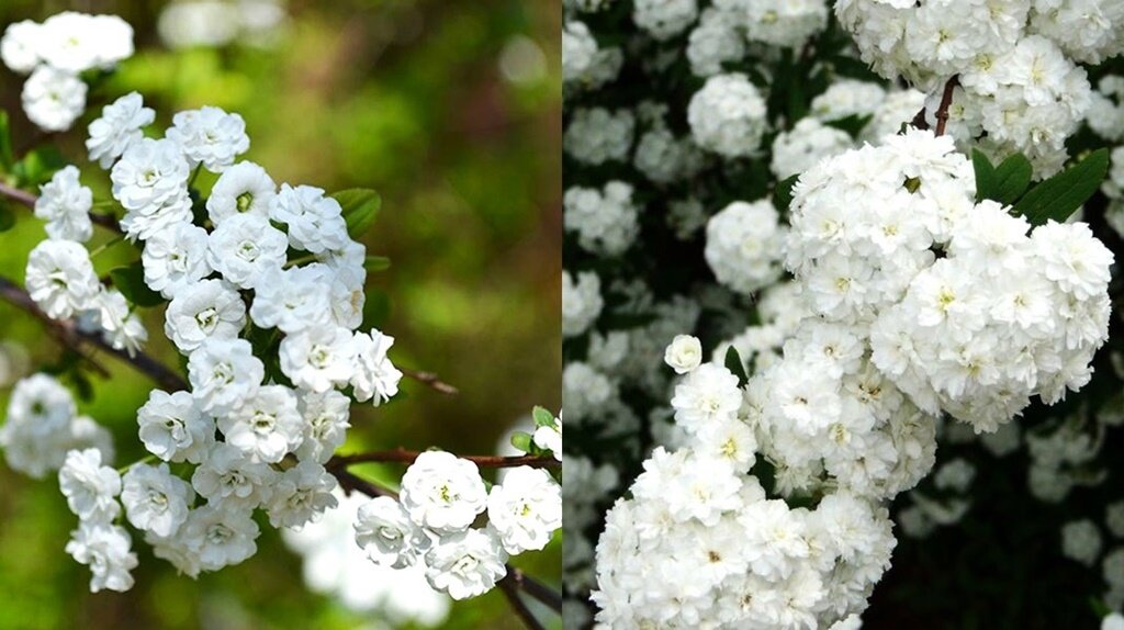 Цветки махровой спиреи напоминают миниатюрные розы, что неудивительно, ведь эти растения входят в семейство Розоцветных. Особенно интересны два вида: спирея кантонская (Lanceata) и спирея сливолистная (Prunifolia), представленные в махровой форме. У кантонской спиреи соцветия напоминают объемные помпоны, достигающие 9 см в диаметре, которые покрывают длинные гибкие ветви, создавая эффект белоснежных водопадов.