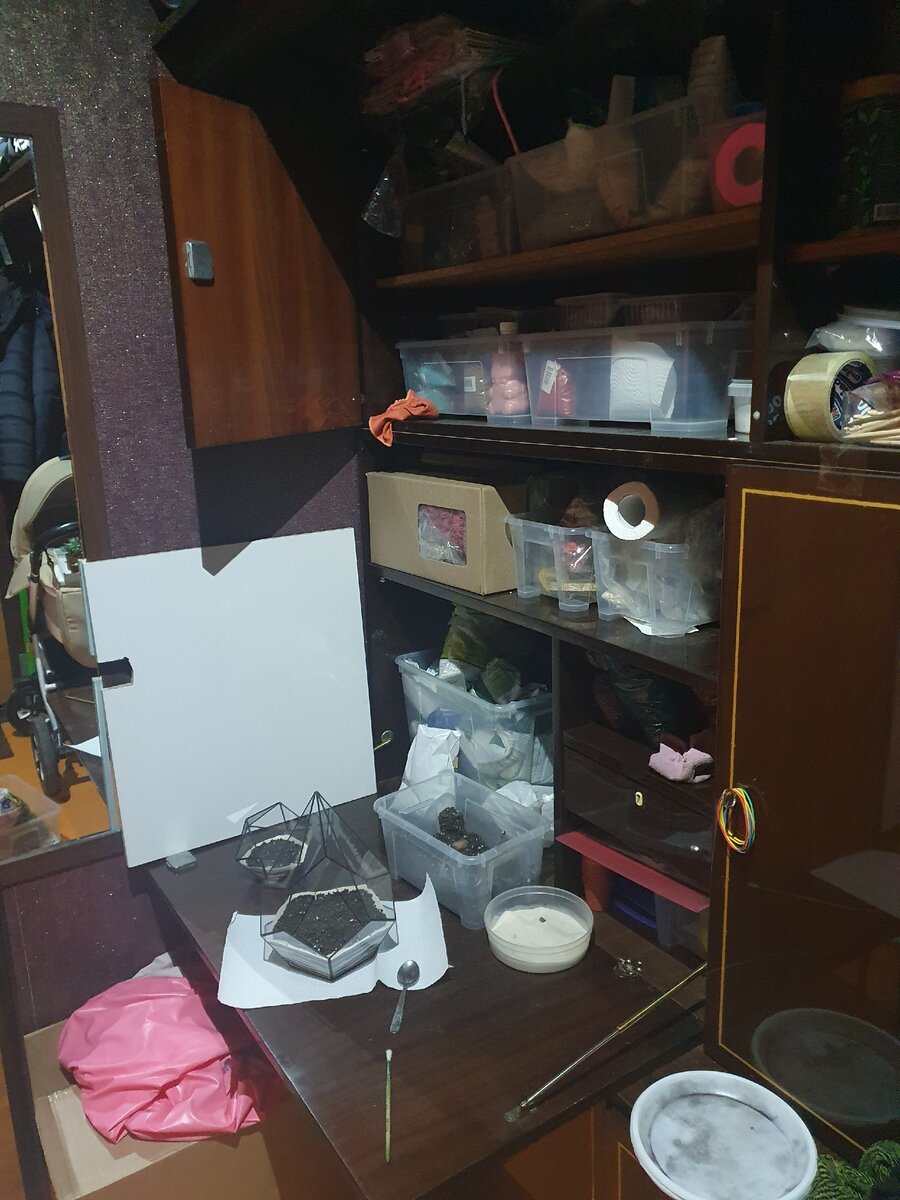 Каждый профессионал понимает, что порядок на рабочем месте способствует вдохновению. В подобном контексте расположение материалов — ключ к успеху. Постоянное использование старого советского шкафа, заполненного разнообразными инструментами для флорариумов и растений, стало привычной практикой. Совсем недавно материалы были отсортированы по выдвижным ящикам, чтобы подготовить все к новому проекту.