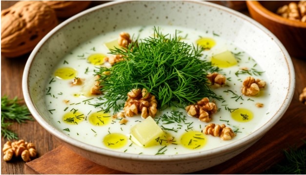 - В большой миске объединяют кислое молоко с огурцами, добавляют чеснок, орехи, укроп и приправляют солью и перцем. Можно разбавить холодной водой для нужной консистенции.