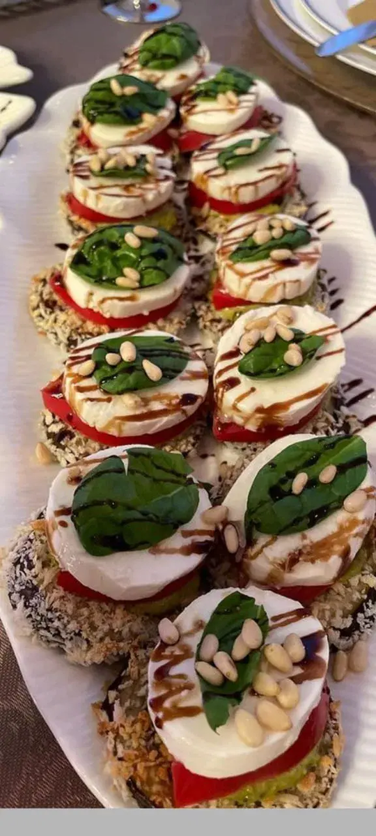 Перед подачей на стол добавить бальзамический соус и посыпать кедровыми орехами, чтобы завершить это визуальное и вкусовое наслаждение.