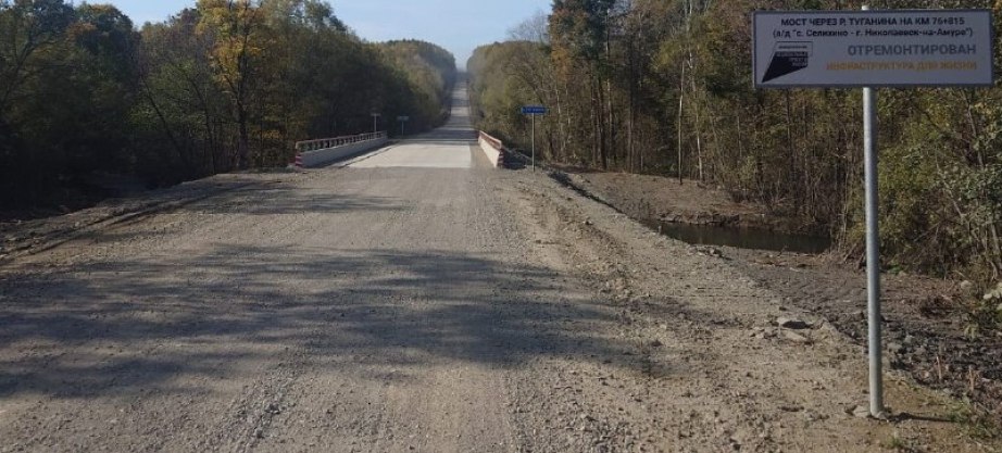 На автомобильной дороге «с. Селихино – г. Николаевск-на-Амуре» завершен ремонт двух мостов – через реки Туганина (76-й км) и Аксян (62-й км). Финансирование ремонта мостов составило более 60 млн и 55 млн рублей соответственно.
