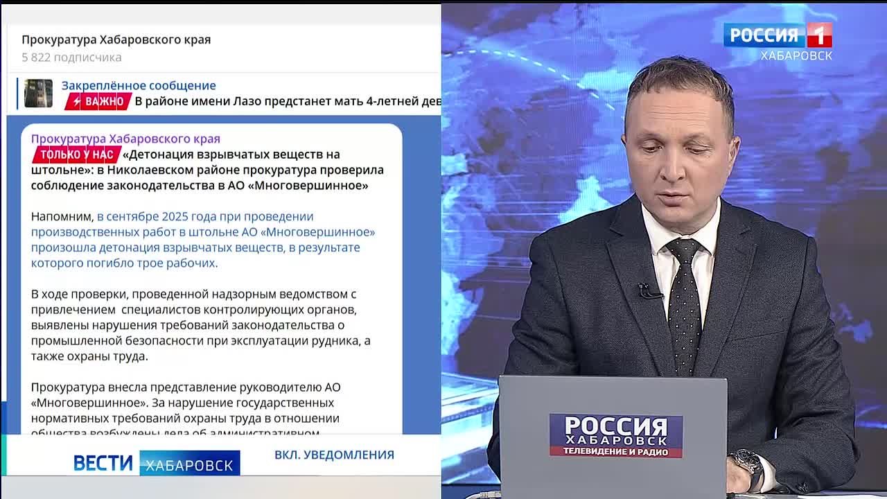 Здесь в сентябре в шахте сдетонировала взрывчатка, погибли трое рабочих. Как сообщается сегодня в телеграм-канале ведомства, в ходе проверки выявлены нарушения требований законодательства о промышленной безопасности при эксплуатации рудника, а также охраны труда.