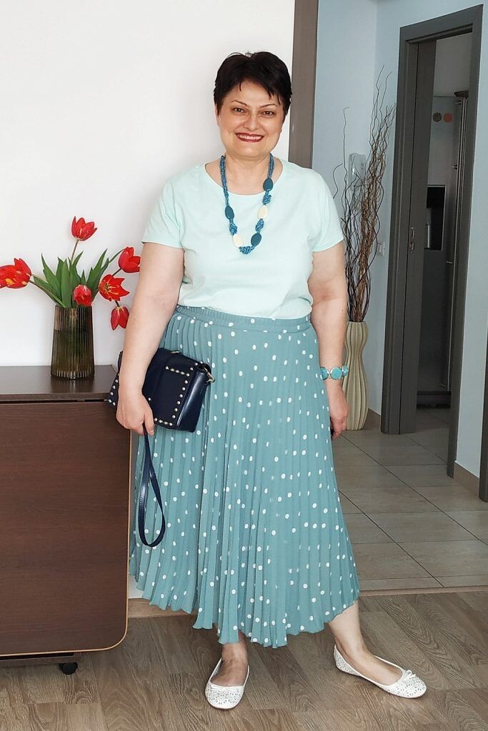 - Легкая шифоновая юбка-плиссе. Юбка до щиколоток в серо-голубом оттенке с белыми горошками отлично смотрится в сочетании с простой белой футболкой. Практичные белые балетки и крупные украшения дополнят образ, придавая ему завершенность.