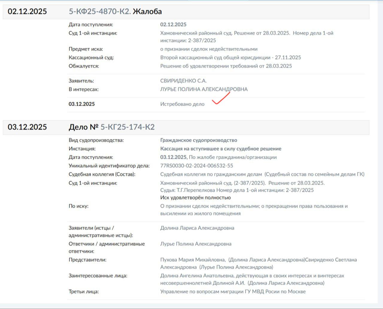 Верховный суд истребовал «дело Долиной». До этого с жалобой на решения нижестоящих судов, оставивших квартиру певице без возмещения полученных ей денег, обратилась покупательница жилья Полина Лурье. Сейчас дело будет изучать, впоследствии его может рассмотреть гражданская коллегия Верховного суда.