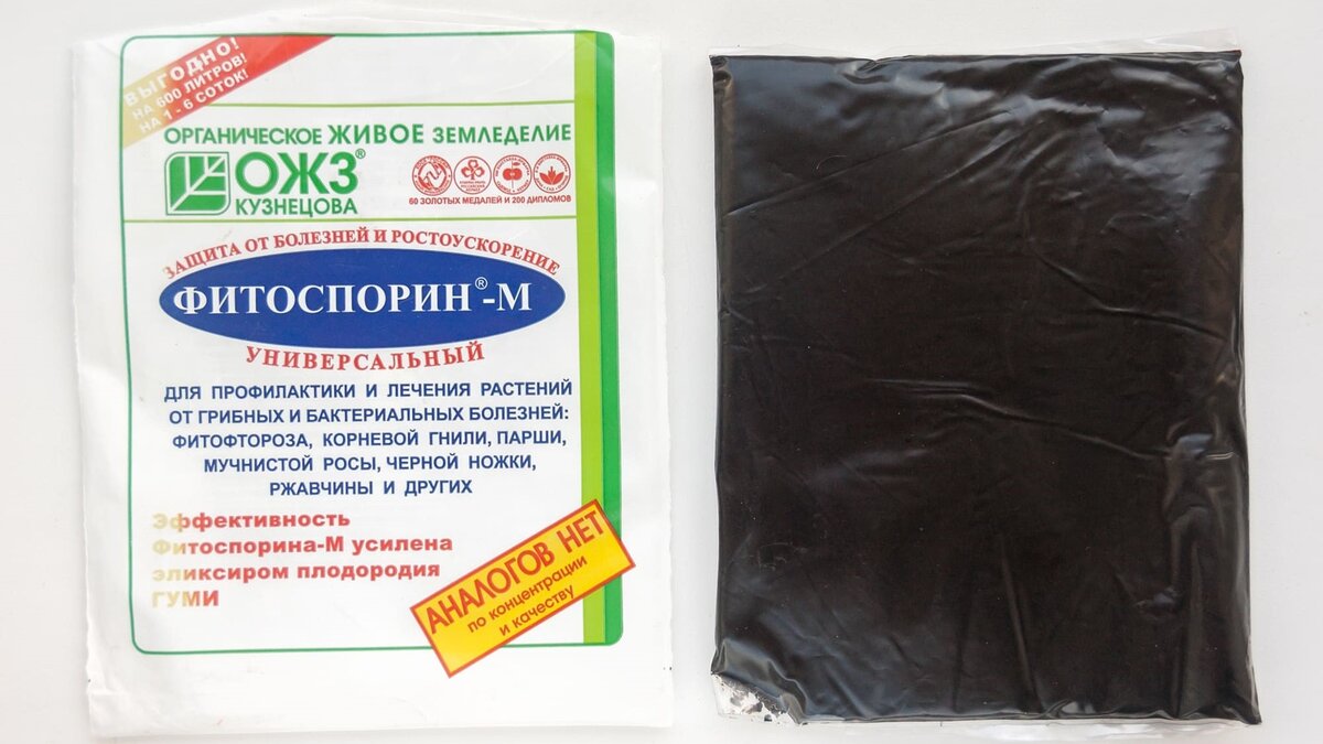 Доступный в виде пасты или порошка, «Фитоспорин» содержит полезные бактерии Bacillus subtilis. Он выпускается с добавлением гуминовых кислот, что улучшает его свойства, но также придаёт пасте тёмный цвет, оставляющий следы на руках. Для удобства рекомендуется использовать перчатки при работе с препаратом.