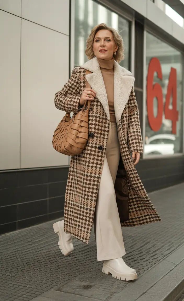 1. Молочно-белые прямые брюки в сочетании с коричневой водолазкой создают комфортный и элегантный образ. Установив воротник за пояс, этот комплект прекрасно вписывается в утеплённое пальто в принт «гусиная лапка», выполненное в теплых коричневых тонах. Для холодных дней идеально подойдут ботинки с толстой тракторной подошвой.