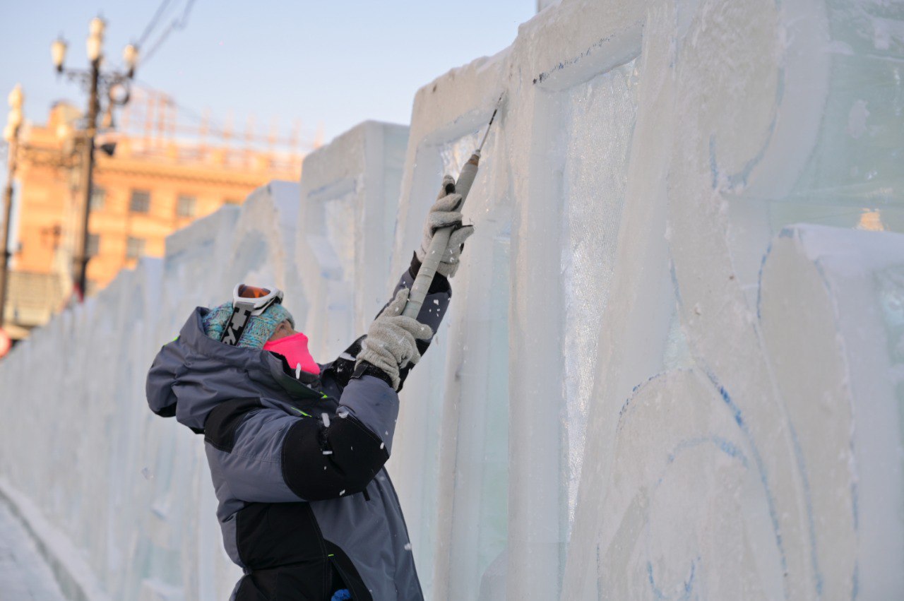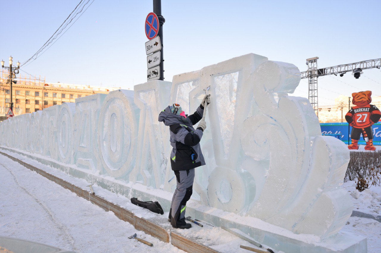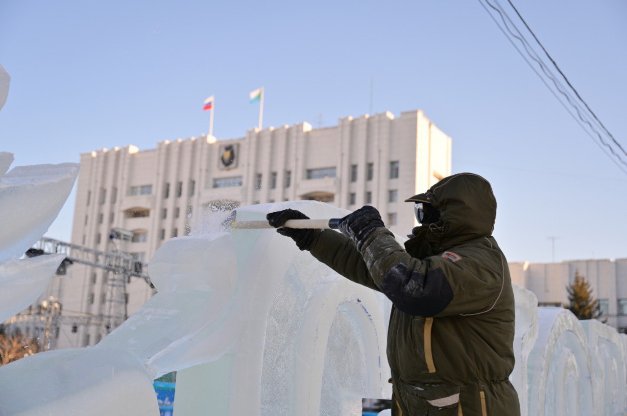 Главная площадь Хабаровска продолжает преображаться к празднику. Один из завершающих штрихов – ледовые фигуры.