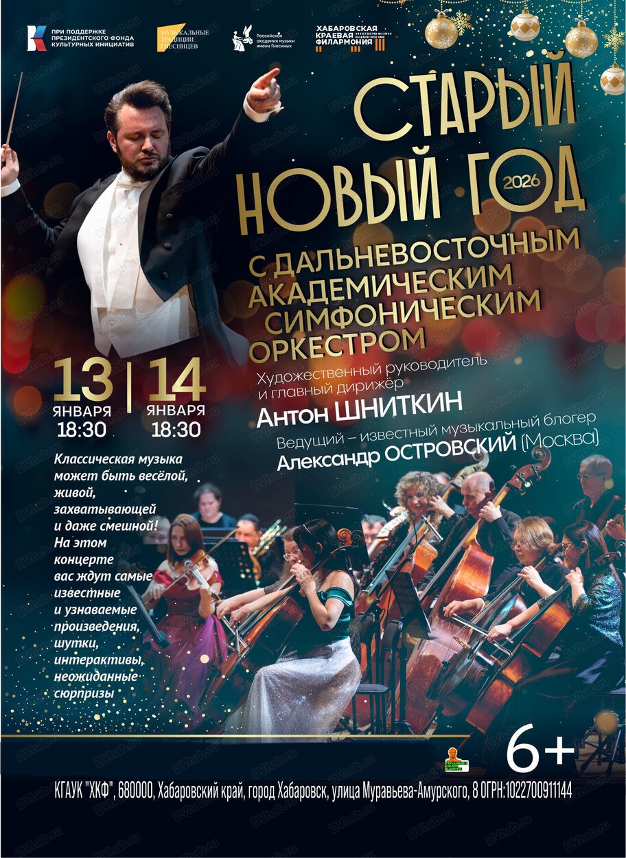 Телеканал «Хабаровск» разыгрывает 2 билета на праздничный концерт «Старый Новый год с ДВАСО», который состоится 13 января в18:30 в зале филармонии. Победители получат пригласительные на двоих на выступление Дальневосточного академического симфонического оркестра под управлением главного дирижёра Антона Шниткина.