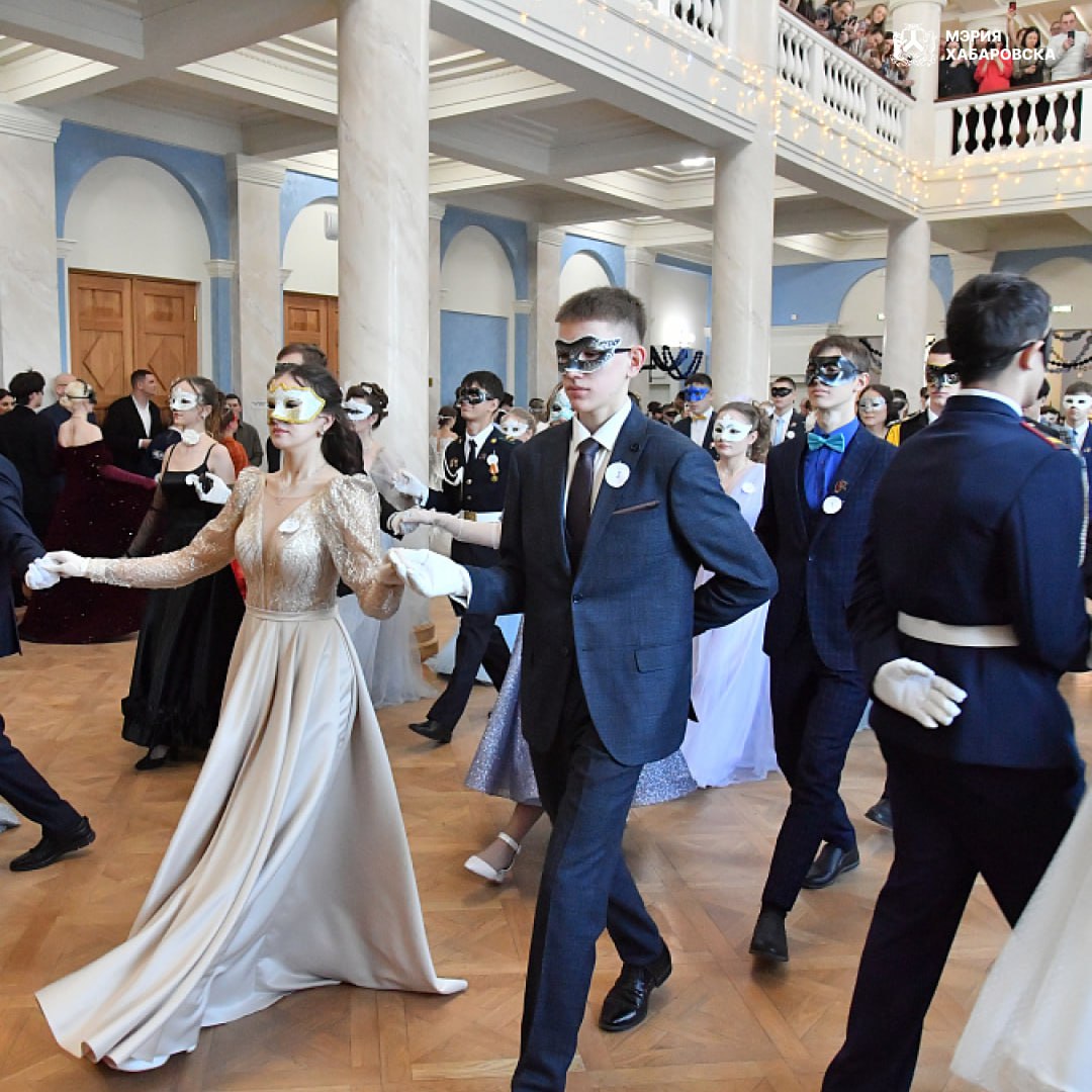 50 пар хабаровских школьников закружились в танце в Доме офицеров Восточного военного округа. Традиция проведения бала зародилась в нашем городе ещё в 2018 году.