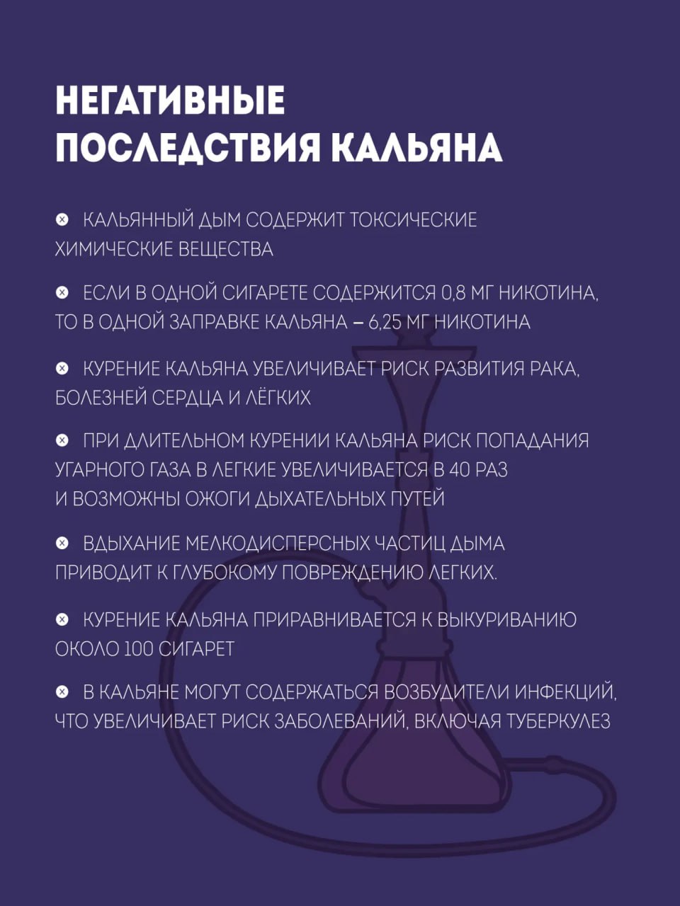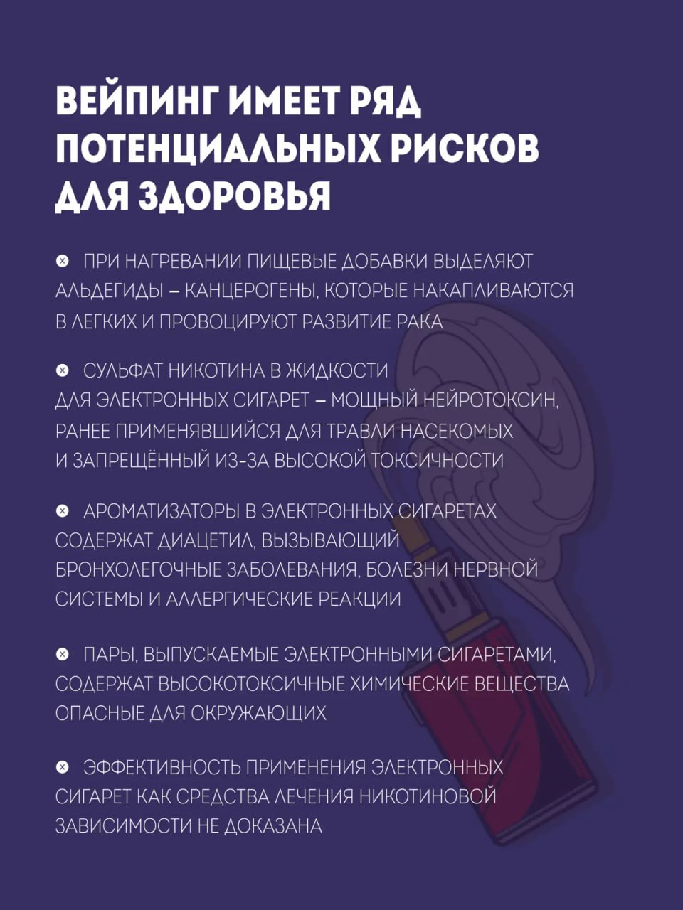 Вейпы и кальяны создают впечатление безопасного способа курения, однако, как и сигареты, имеют ряд серьёзных последствий для здоровья. Они также приводят к зависимости, проблемам с лёгкими и сердечно-сосудистыми заболеваниями.