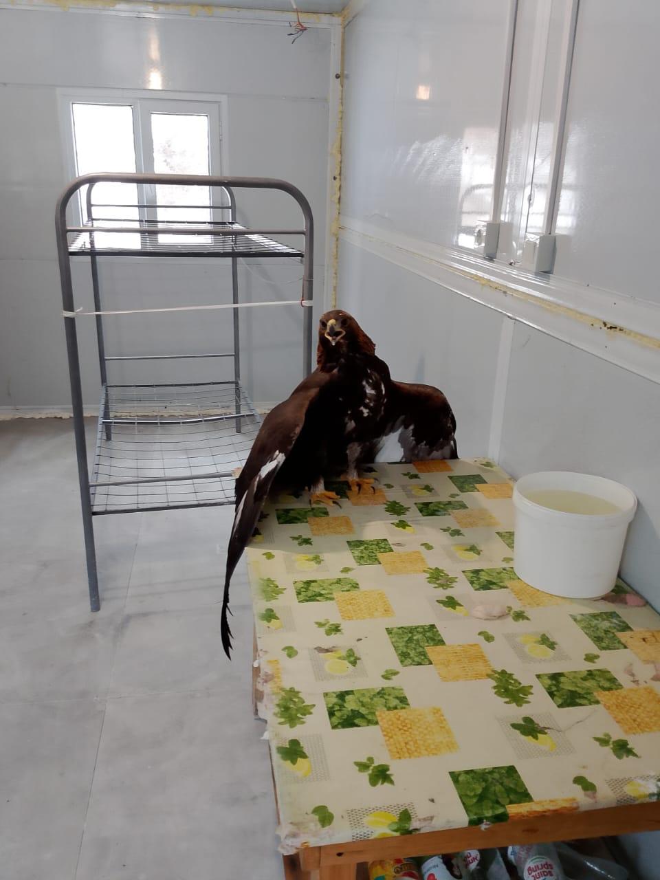 Чтобы не допустить переохлаждения и защитить хищника от возможных опасностей, его временно разместили в теплом пустом вагончике и сообщили о находке в Росприроднадзор. По фото- и видеоматериалам специалисты Службы установили, что перед ними молодая особь беркута — редкого вида, занесенного в Красную книгу России.