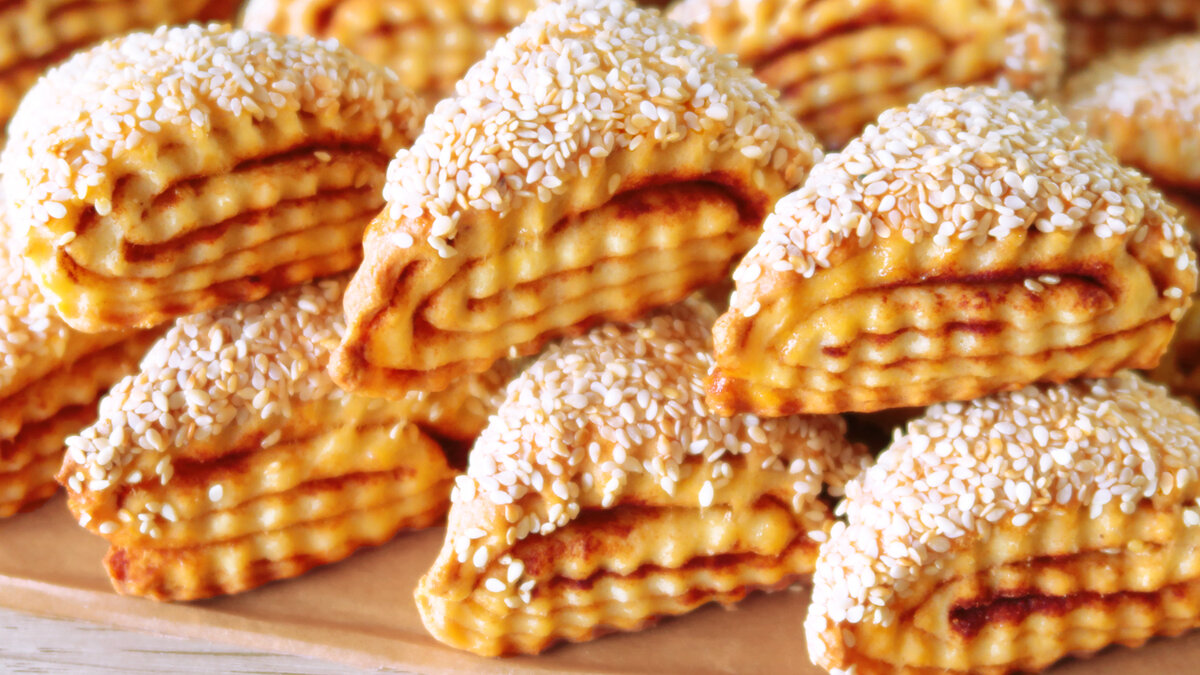 Полученные треугольнички стоит смазать желтком, смешанным с молоком, и обмакнуть в кунжут для придания текстуры. Выкладывайте заготовки на противень и отправляйте в заранее разогретую до 180 градусов духовку. Выпекайте печенье около 28-30 минут, пока оно не подрумянится.