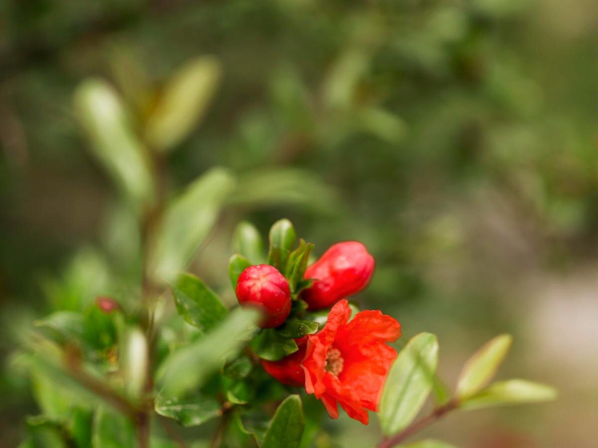 Цветы граната распускаются с начала лета и радуют своим великолепием до самой осени. Они бывают различных типов: одни цветки дают плоды, а другие остаются только декоративными. Плодоносящие цветки можно легко отличить по утолщенному основанию чашечки. Не стоит переживать, если некоторые бутоны осыпаются — это естественный процесс. При правильном уходе на кусте может вырасти до 10–15 плодов весом по 50–100 граммов каждый.