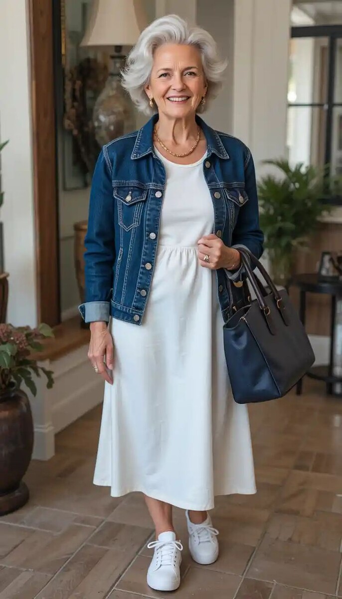 1. Легкость в белом: Идеальное сочетание — белое платье А-силуэта с акцентом на талии, который визуально скрывает лишние объемы. Добавьте темно-синюю джинсовую куртку и белые кроссовки. Такой наряд идеален для повседневных прогулок.