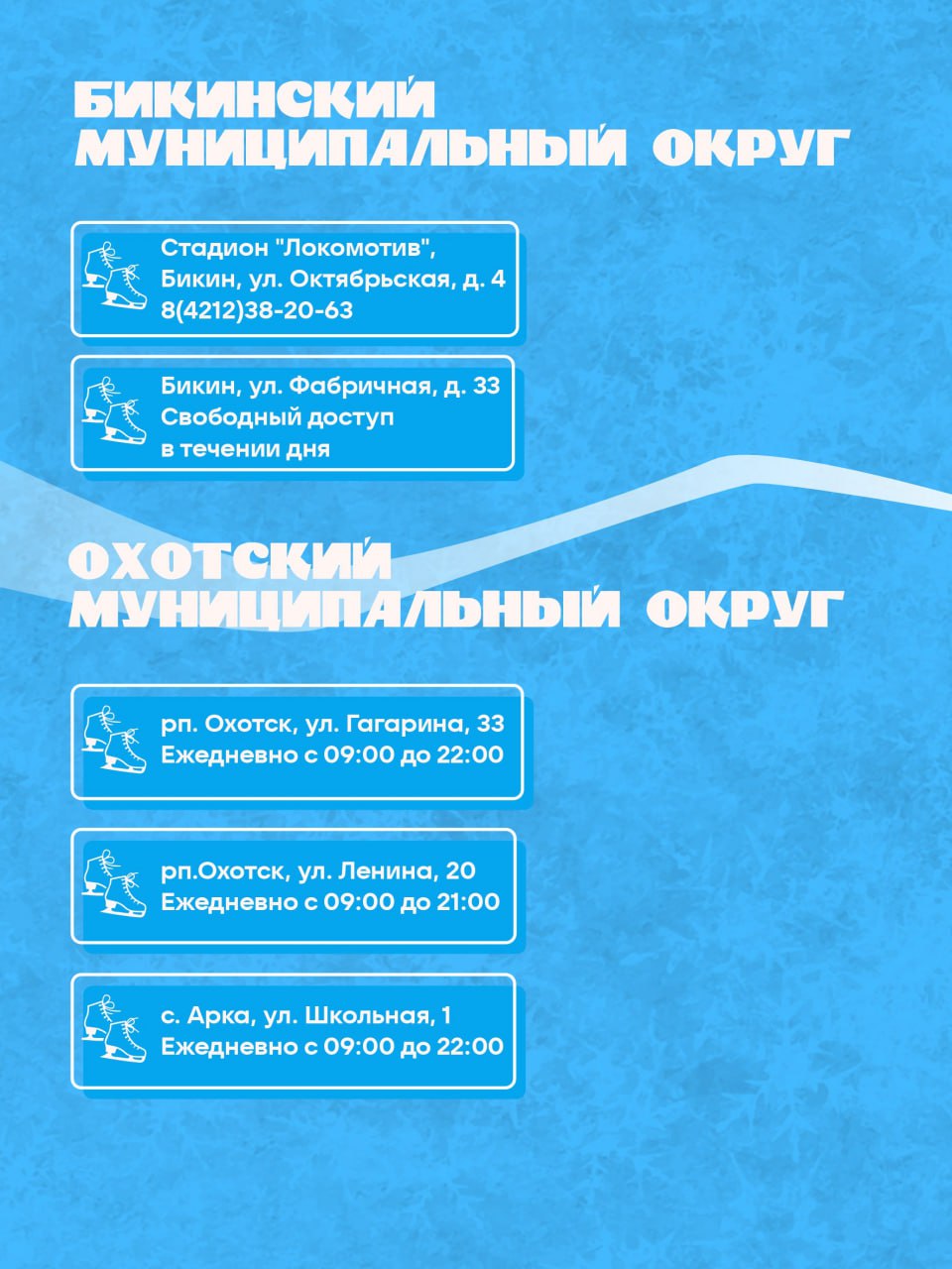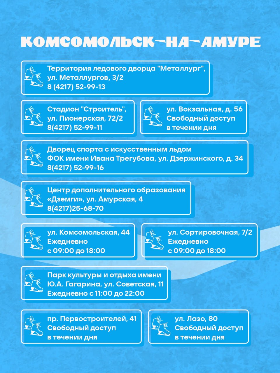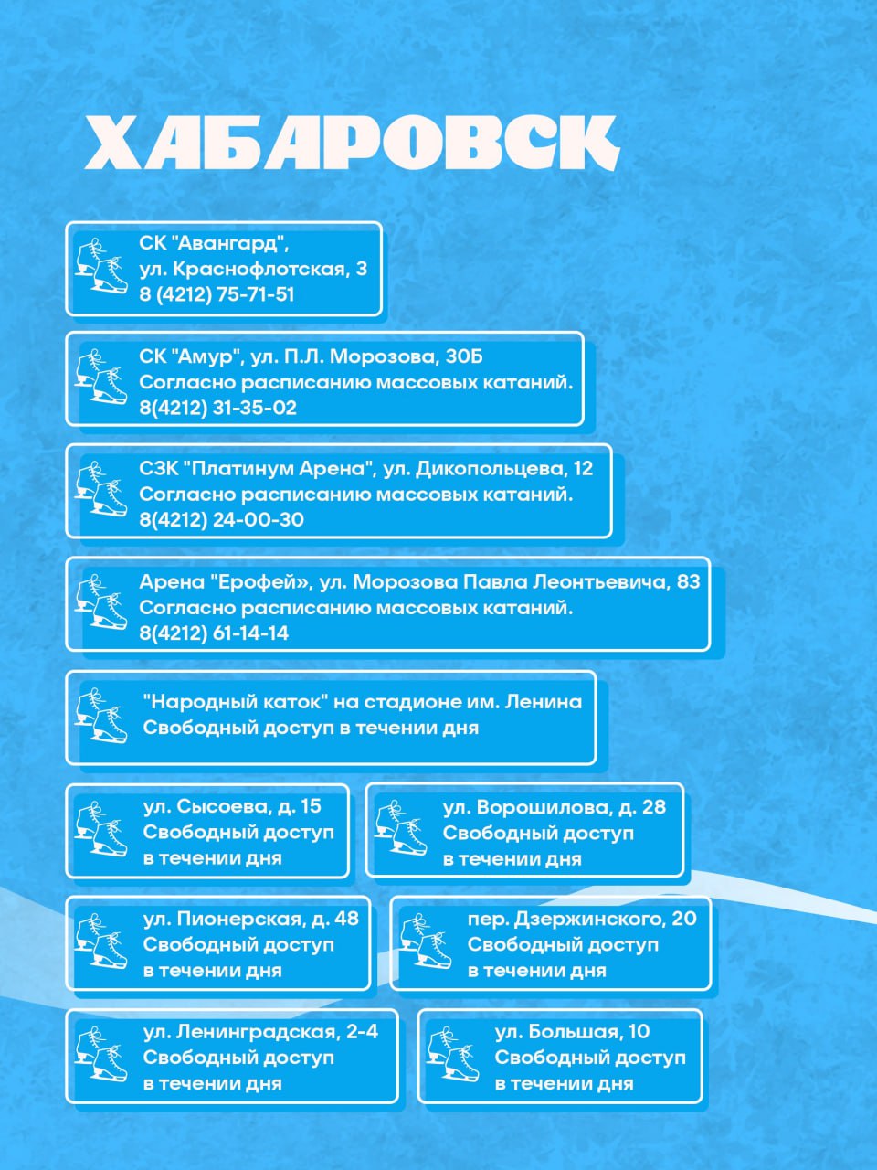 Перечень мест в Хабаровском крае, где можно активно провести время на новогодних каникулах и покататься на коньках, разместила "Дирекция спортивных сооружений Хабаровского края".